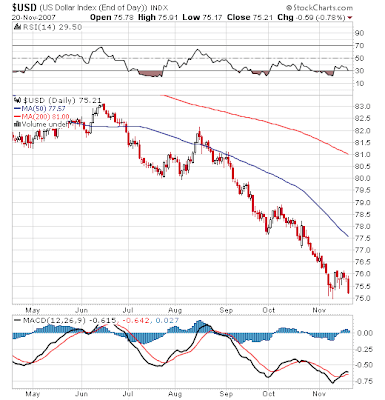The USD bottom arrived in the mail today in the form of the cover of the Economist. Like the pundits exclaiming gold was headed to 2000 per ounce in May 06 (it may well be, but in the intermediate term at least, that signaled the top of the move) I think this could be a strong sign that we are oversold at these levels. When super-models, rappers, magazines and dictators are all at once signaling the imminent demise of the USD, it makes you start to wonder....I'm thinking mean reversion at the very least.