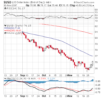 The reason I bring all of this up, is that a second factor speculators look for has come into play in the USD: new bearish news has been unable to push the price to new lows. This week the markets decided that its significantly more likely that the Federal Reserve is going to cut interest rates when it meets in December. This news, especially in light of all of the dollar collapse and currency diversification talk, should have sent the USD reeling, or hitting new lows at the very least, but take a look at the chart, not only did the dollar not make new lows, it challenged the highs of the previous week: